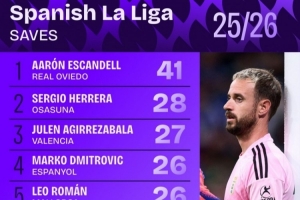 西甲扑救次数排行:皇家奥维耶多门将埃斯坎德尔41次居首