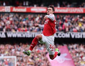 英超第4轮在酋长球场迎战诺丁汉森林的比赛第31分钟,苏维门迪在禁区弧顶位置奉献了一记非常精彩的凌空斩,打进了自己加盟阿森纳的处子球,帮助球队取得1-0的领先。