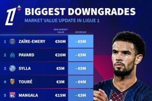 体育资讯10月12日讯 德国转会市场更新了法甲球员的身价,并列出身价下跌排名,扎伊尔-埃梅里、帕瓦尔、西拉-500万欧居首。